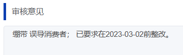 广州某产品因宣称“绷带”备案被驳回,审核意见一栏注明,“绷带 误导消费者”,并限期整改。